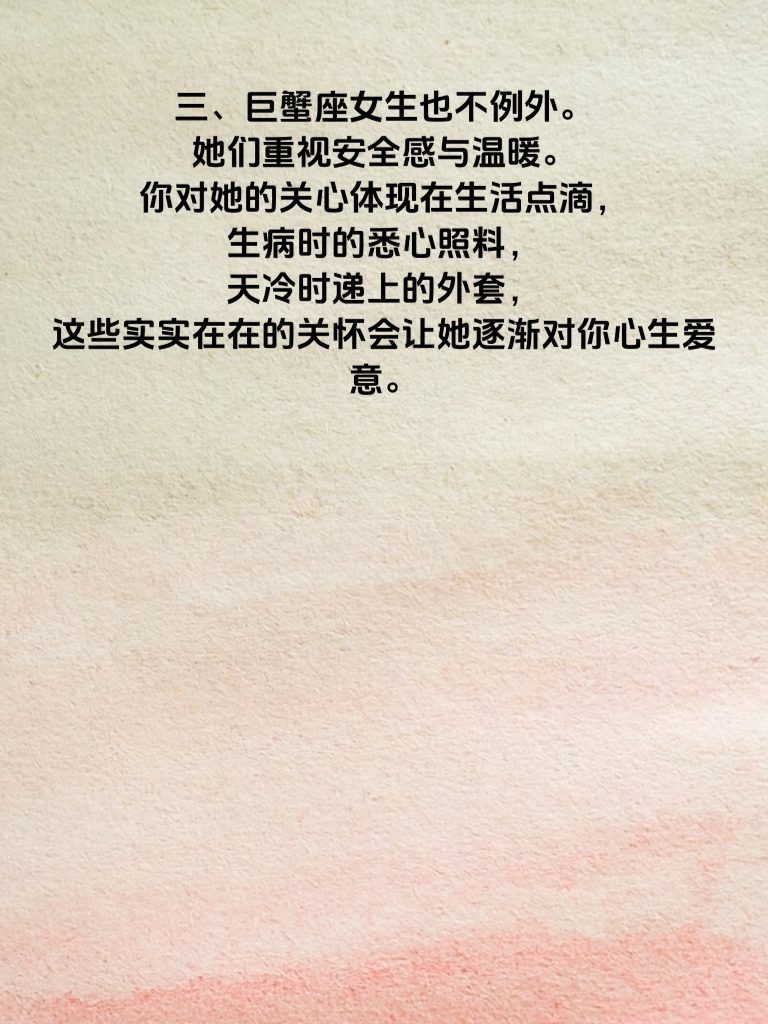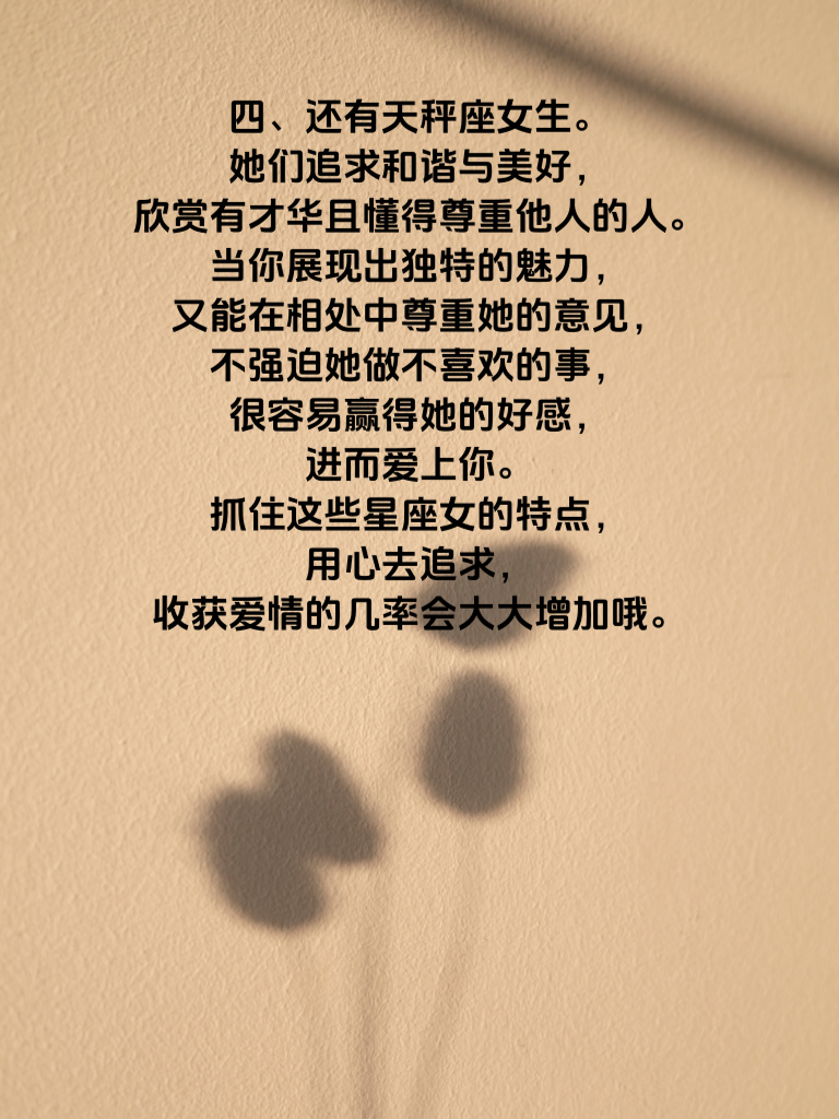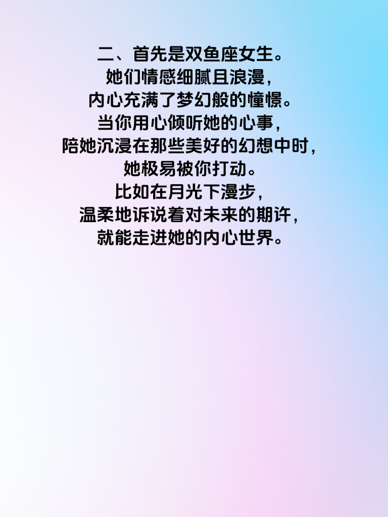 一、男人必看:这3个星座女最易爱上你。爱情的旅程中,若能知晓哪些星座女更容易倾心,无疑是觅爱路上的有力指引。 二、首先是双鱼座女生。她们情感细腻且浪漫,内心充满了梦幻般的憧憬。当你用心倾听她的心事,陪她沉浸在那些美好的幻想中时,她极易被你打动。比如在月光下漫步,温柔地诉说着对未来的期许,就能走进她的内心世界。 三、巨蟹座女生也不例外。她们重视安全感与温暖。你对她的关心体现在生活点滴,生病时的悉心照料,天冷时递上的外套,这些实实在在的关怀会让她逐渐对你心生爱意。 四、还有天秤座女生。她们追求和谐与美好,欣赏有才华且懂得尊重他人的人。当你展现出独特的魅力,又能在相处中尊重她的意见,不强迫她做不喜欢的事,很容易赢得她的好感,进而爱上你。抓住这些星座女的特点,用心去追求,收获爱情的几率会大大增加哦。
